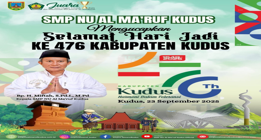 Segenap Pimpinan Guru dan Karyawan SMP NU Al Ma'ruf Kudus mengucapkan Selamat Hari Jadi Ke 476 Kabupaten Kudus-ku, Kudus Semakin Maju!