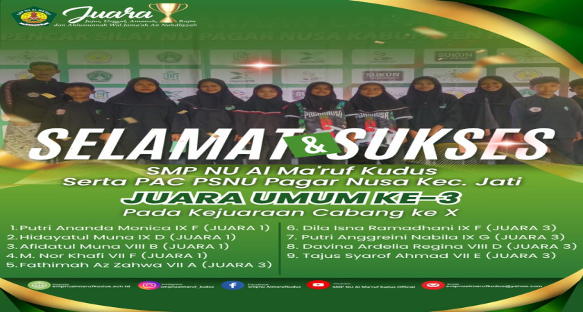 Selamat dan Sukses kami ucapkan untuk para Juara Siswa siswi SMP NU Al Ma'ruf Kudus